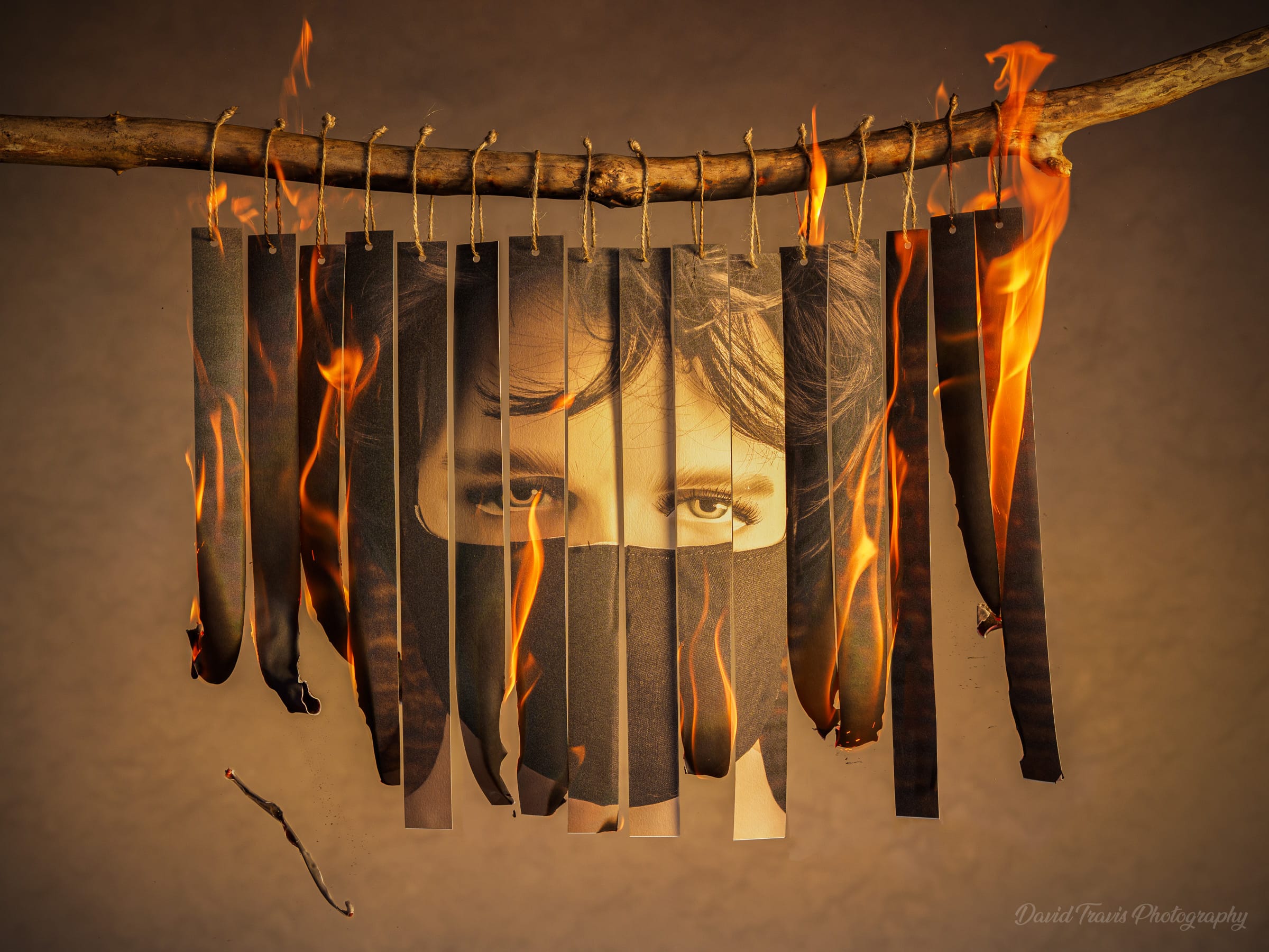 To express this visually I created a series of images that feature Imbolc symbols such as candles, snow drops, and a Brigid's Cross alongside symbols of coronavirus such as a masked face and social isolation. Because Imbolc is a fire festival, I printed the images, set them on fire, and re-photographed them as they burnt.