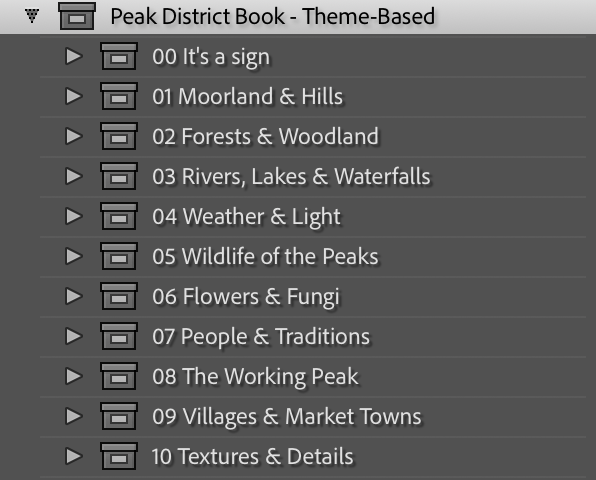 I reviewed some of the photography books in my collection. I noticed they tended to have 100-150 images, so that was what I decided to aim for. In my initial set, I had ten themes and around 15–60 images per theme. This gave me breathing room, but it also forced me to curate. The key now was to define what each theme was really about so I could judge which images served the book, and which were just good standalone shots